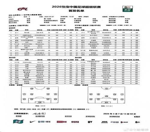 中超首轮山东泰山对阵辽宁首发出炉