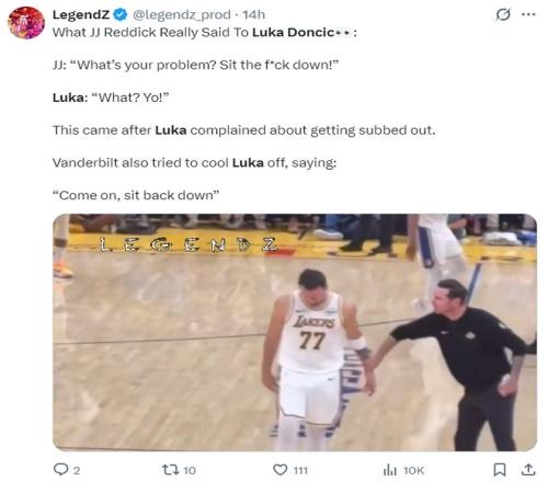 这场比赛前,口型媒体晒出了勇士VS湖人时的争议一幕,那就是雷迪克伸手去拉东契奇,结果东契奇将雷迪克的手甩开,雷迪克直接开喷::你有什么毛病? 给我XX给我坐下。