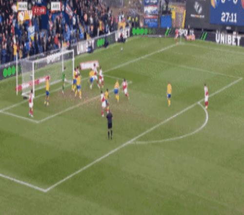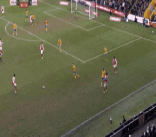 第64分钟,阿森纳打出边中结合,可惜门前近在咫尺的打门,被曼斯菲尔德球员诺勒门线解围。