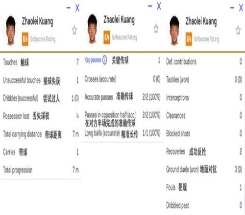这上场后10分钟内,邝兆镭一共触球7次,1次接球失误,1次尝试过人但没有成功,另外还有4次丢失球权,有2次成功反抢。另外他还有3次跟对手进行地面对抗但都失败,还有1次犯规,1次带球7米远。邝兆镭最亮眼的数据来了——2次在对手半场的准确传球,1次精准长传,还有1次关键传球。