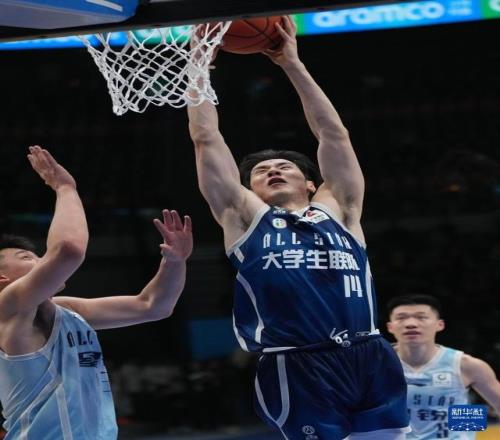 3月7日,大学生联队球员王浩霖(前右)在比赛中扣篮。新华社记者 孟永民 摄