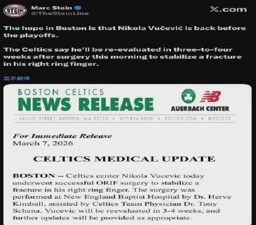 凯尔特人官方宣布:武切维奇接受了无名指骨折手术,3-4周后接受复查。名记Stein对此表示,凯尔特人期望武切维奇能够在季后赛前回归。