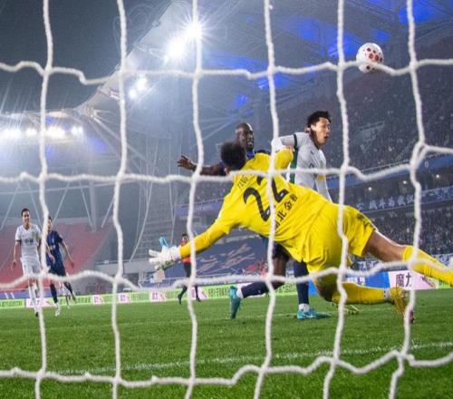 3月8日,武汉三镇队守门员方镜淇(右)出击防守北京国安队球员张玉宁。新华社记者 肖艺九 摄