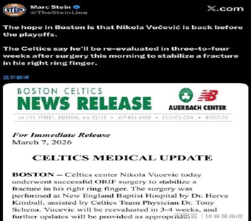 在刚刚宣告回归赛场之际,凯尔特人队却传来另一则令人揪心的消息:球队核心球员武切维奇不幸遭遇无名指骨折,已接受手术治疗,预计将在3至4周后接受复查以确定恢复情况。据知名记者Stein透露,凯尔特人方面寄望武切维奇能在季后赛前重返赛场,为球队争冠助力。