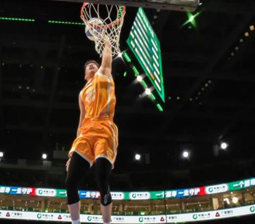 第三位出场的是俞泽辰,他尝试转体360扣篮失败,随后赵继伟抛球打板,俞泽辰接球滞空转体暴扣,也是获得50分满分,两扣同样是100分。