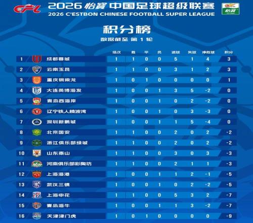 3月8日晚,伴随着北京国安客场2-0完胜武汉三镇,2026赛季中超首轮战罢。赛后,中超官方发布了积分榜。