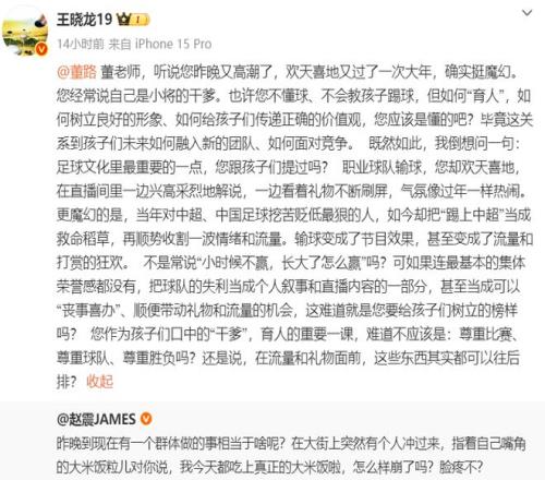 日前,前国脚王晓龙在个人社交平台上发文,跟名嘴董路老师大谈足球文化和“育人”,并给球员树立良好形象并传递正确的价值观(下图)。王晓龙表示,邝兆雷所在的职业球队输球时,“您却欢天喜地,在直播间里一边兴高采烈地解说,一边看着礼物不断刷屏,气氛像过年一样热闹”,“输球变成了节目效果,甚至变成了流量和打赏的狂欢。”。