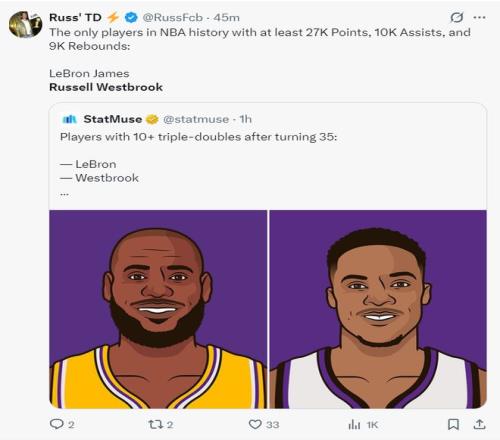 7.NBA历史上只有两人能拿到27000分+10000助攻+9000篮板,威少、詹姆斯。