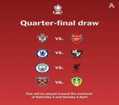 3月10日,英格兰足总杯1/4决赛的抽签结果已经出炉,曼城与利物浦狭路相逢。本次抽签嘉宾为乔·科尔和乔·哈特。全部抽签结果: