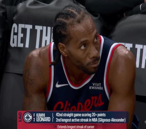 莱昂纳德连续42场得分20+,继续刷新生涯最长纪录,也是继续创造NBA历史30岁后连续20+历史最长纪录。