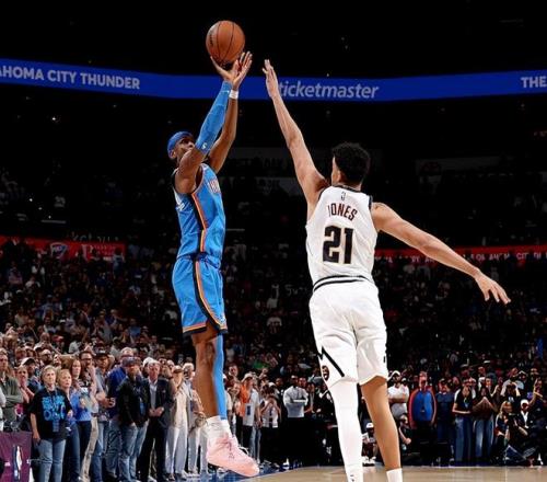 掘金队全军出击,体型优势尽显无疑。全场比赛下来,掘金队篮板球56-37赢了雷霆队19个,前场篮板16-3赢了雷霆队13个,内线得分(54-48)和二次进攻得分(29-7)完爆雷霆队。掘金队拳拳到肉,可他们还是打不死对手,关键在于雷霆队做好了两件事。第一,雷霆队在三分线外惩罚了掘金队收缩的防线,全队三分球47投19中,命中率高达40.4%。第二,雷霆队进攻运转太稳了,全队全场仅出现3次失误,刷新联盟本赛季单场失误数纪录,掘金队很难打出自己最擅长的快攻反击。