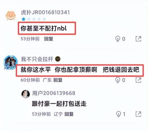 在全队12人登场,10人正负值达到两位数的情况下,范子铭作为北京队内仅有的3名顶薪球员,正负值却差点为负值,属实让人难以置信。也难怪,赛后有球迷吐槽:“你甚至不配打NBL”、“就你这水平,你也配拿顶薪,把钱退回去吧”、“能被杨文学连续单吃两次的应该不多了”......