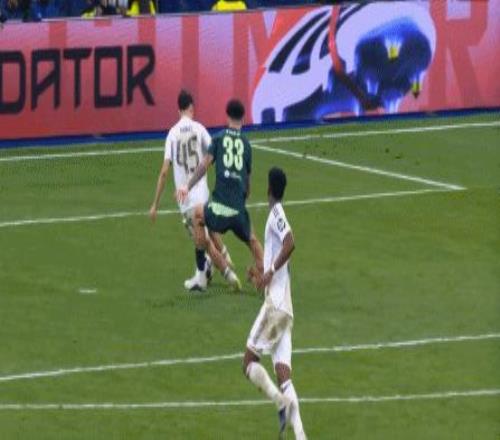 然后就在这次进攻的角球防守里,皇马抓住胡桑诺夫和罗德里的连接失误,让维尼修斯直接用反击制造点球: