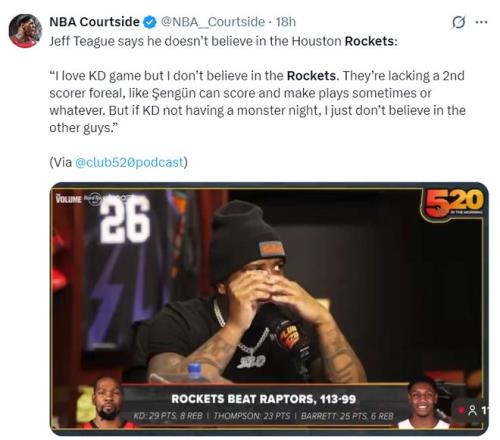 前NBA球员蒂格:我喜欢看杜兰特的比赛,但我并不看好火箭。他们缺少了一个能独当一面的第二巨头,像申京这样的球员只能偶尔贡献。一旦杜兰特无法打出超水平的表现这支球队就没有真的值得信任的球员了。