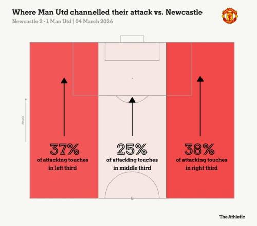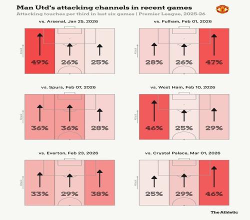 对水晶宫的比赛中,曼联左路进攻占比达到本赛季最低水平,如果不是水晶宫打了欧协杯体力不足,下半场还少打一人,曼联能否取胜也会构成疑问。