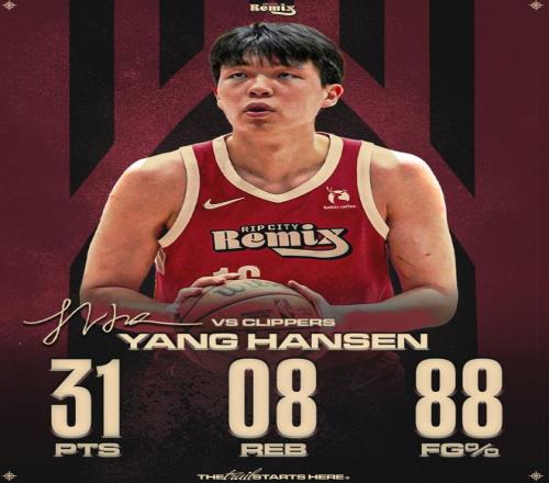 杨瀚森此役是在G联赛出战背靠背的第二场,他在背靠背G1中16中14,三分1中1,拿到31分8篮板3助攻1抢断1盖帽打出G联赛生涯最高光的一场比赛,此役他继续代表混音先发登场。