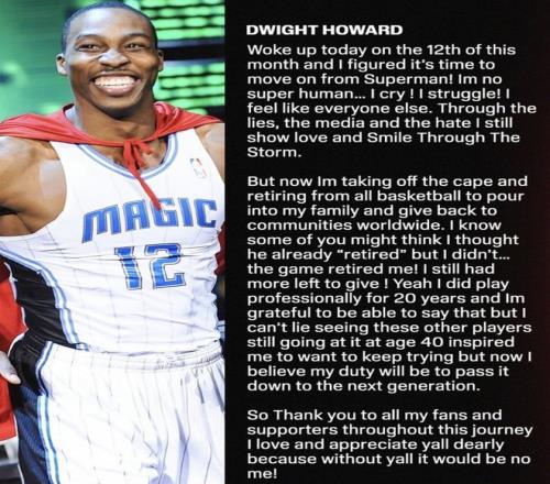霍华德用一份长文正式告别篮球生涯,辞藻华丽,面面俱到,催人泪下,简单总结如下!第一,我非钢铁之躯,有着与常人无异的喜怒哀乐,经历着谎言与舆论风暴,但我始终用爱回应,在风雨中保持微笑。第二,我要感谢所有球迷和支持者,没有你们就没有今天的我;我也要感谢所有的质疑者,每一次诋毁都会让我变得更强大。我的纪录片即将问世,你们能看到一个全面真实的我。第三, 告别篮球生涯后我要拥抱家人,回馈社区,即便没有退役巡演,可我决定创造一场特殊的旅程,带着回馈之心走遍世界,为素不相识的人播撒善意。