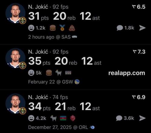 全场约基奇17中9,爆砍31分20板12助3断2帽超级大三双,成为本赛季联盟唯一一位单场拿到过至少30+20+10的球员,并且他已经做到三次。