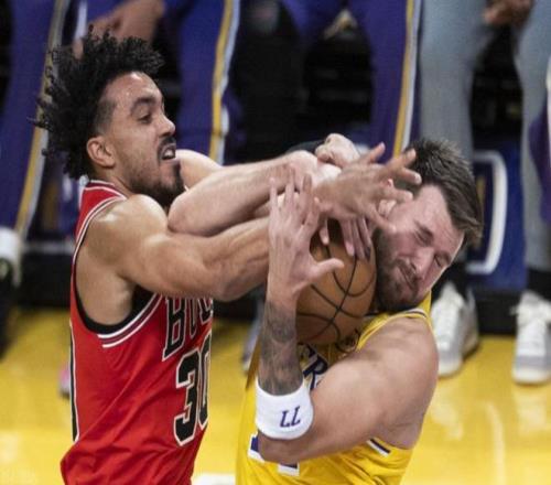 易边再战,詹姆斯快攻起飞单臂滑翔飞扣,湖人下半场开局领先公牛到10分。詹姆斯飞身上篮再打进得到7分,东契奇干拔三分也进,湖人打出一波14-3领先到18分。詹姆斯连续拼下前场板补篮打进,下半场已经5中5拿到11分2篮板2助攻2抢断。约什-吉迪里突外投连拿5分止血,詹姆斯失误,理查德斯快攻空接扣篮再中,三节打完,公牛98-108追到10分分差。