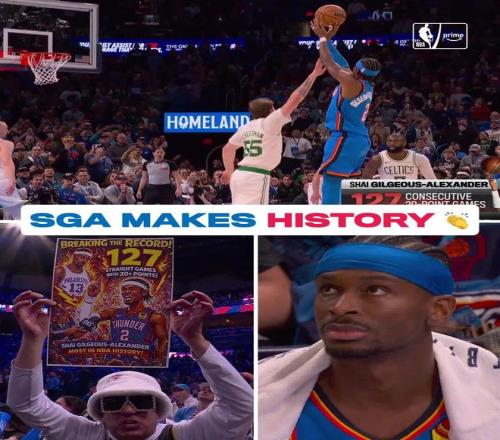 这记中投可不简单,帮助亚历山大超越张伯伦(连续126场20+),达成了连续127场20+成就,NBA官方及各大媒体也第一时间晒图庆祝。