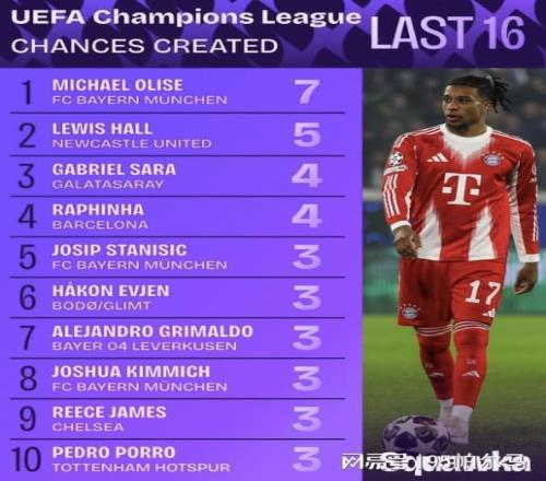 最新的代表作发生在拜仁对阵亚特兰大的欧冠1/8决赛首回合,奥利塞在进攻三区内的传球次数最多(32次)、对手禁区内触球次数最多(9次)、创造机会最多(7次)、传中次数最多(6次)、射门次数并列最多(5次)、射正最多(4次)。
