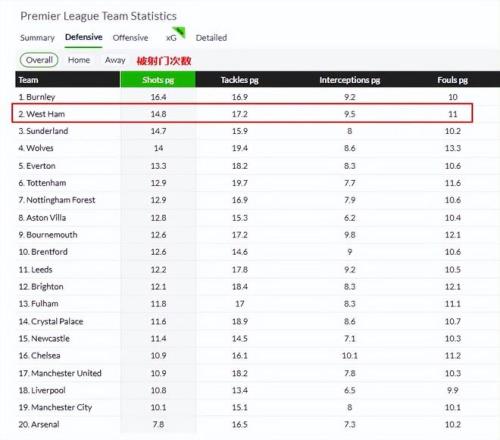本赛季西汉姆联在英超场均被射门次数达到14.8次,只比联赛排名倒数第二的伯恩利少,比其他球队都要多。相比之下,曼城场均被射门10.1次,排名英超第二少。