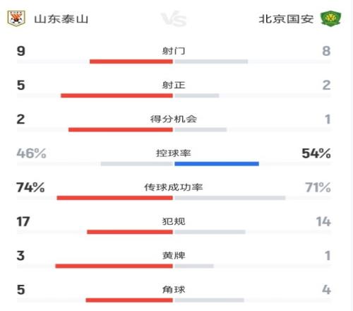 控球率方面,泰山队为46%,国安队为54%。射门方面,泰山队9次射门5次射正,国安队8次射门2次射正。泰山队传球成功率为74%,国安队传球成功率为71%。