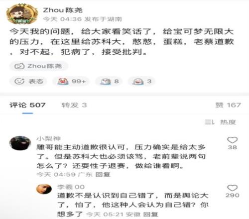 最终鲷哥给郑翔刷火箭道歉,并在鱼吧发长文,承认自己给苏科大压力过大,向其道歉。