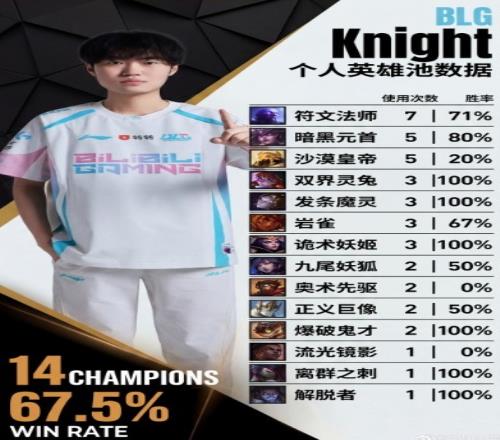 BLG Knight 14个英雄,选用最多的英雄为瑞兹(7次),胜率71%