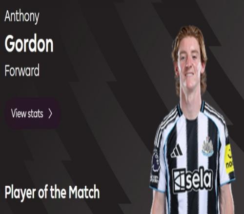本场比赛纽卡前锋戈登打进全场唯一进球,赛后他也当选英超官方球迷票选全场最佳球员。