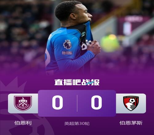 全场比赛结束,伯恩利0-0伯恩茅斯。