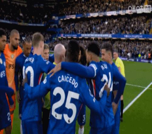 切尔西首发:1-罗伯特·桑切斯、27-古斯托、29-韦斯利·福法纳、23-查洛巴、3-库库雷利亚、24-里斯·詹姆斯、25-凯塞多、10-帕尔默、8-恩佐、49-加纳乔、20-若昂·佩德罗