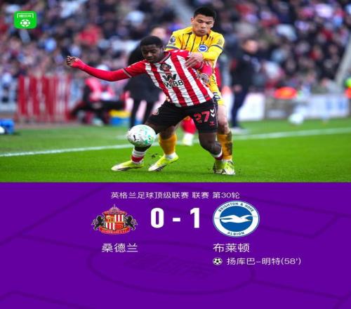 北京时间3月14日英格兰足球顶级联赛第30轮,桑德兰主场对阵布莱顿。下半场扬库巴-明特破门打入制胜球。最终比分桑德兰 0-1 布莱顿。