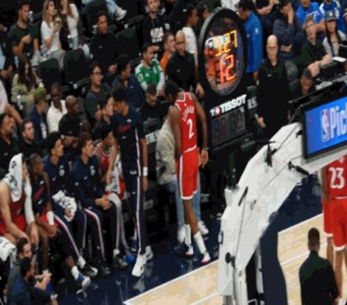 两人摊手特写转播视角最终,裁判吹罚詹姆斯提前犯规,戈登进球无效,掘金发边线球。GIF-