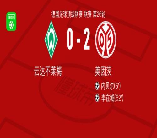 北京时间3月15日德国足球顶级联赛 联赛 第26轮,云达不莱梅主场对阵美因茨。美因茨内贝尔破门,李在城破门。最终比分云达不莱梅 0-2 美因茨。