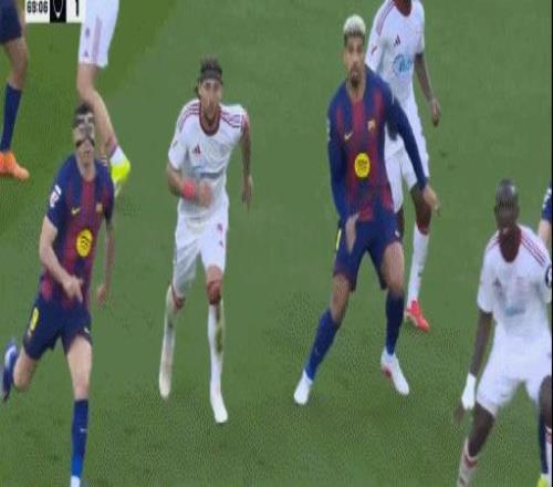 第67分钟,亚马尔、阿劳霍、卡萨多登场,坎塞洛、巴尔德吉、贝尔纳尔下