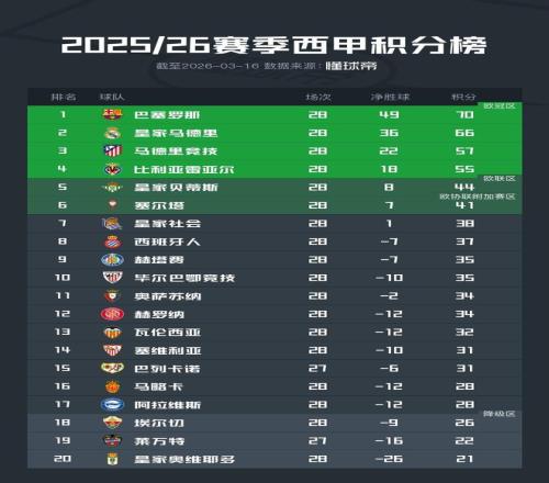 西甲前28轮积分榜:巴萨领先皇马4分领跑,马竞欧冠资格无忧