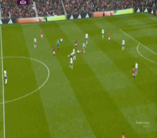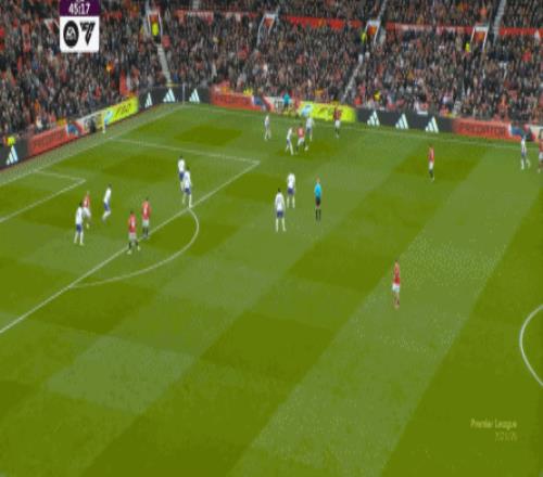 整个上半场,曼联稍有优势,尤其是在最后15分钟,但在进攻端形成的威胁不够明显,能从边路和禁区角附近起脚,也能形成多点包抄的消耗效果,但前场没有大个子,争顶上还是存在不足。