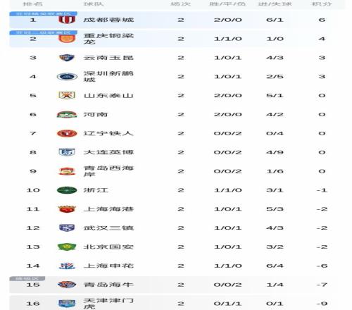 在目前的中超积分榜上,排名榜首的球队是蓉城,他们接连击败新鹏城以及海牛,在没有被扣分的情况下,2轮比赛积6分。中超新军铜梁龙表现不俗,在客场平了津门虎,主场击败中甲冠军铁人,2轮拿到4分,排在第2位。玉昆、新鹏城都是1胜1负,也没有被扣分,排名第3、4位。