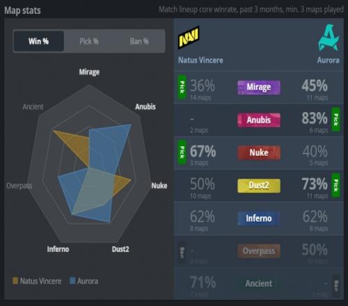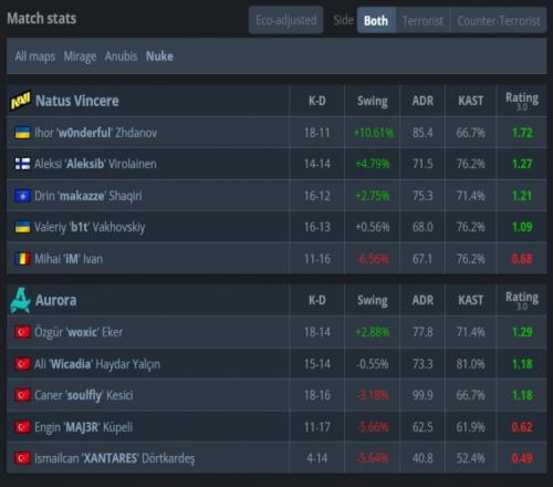 易边再战,手枪局woxic手枪局三杀,NAVI次回合强起失败连送3分。来到长枪局,Aurora拱门夹A得手拿到第7分。第17回合Aurora四人A1与A二楼出击被NAVI围剿在A区,次回合Aurora干拉A点送makazze三杀,NAVI拿到第11分。Aurora经济崩盘让出赛点,最终Aurora枪械不全打B失败,makazze看B再拿三杀,NAVI以13-7拿下图一。