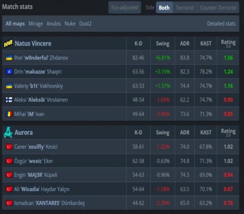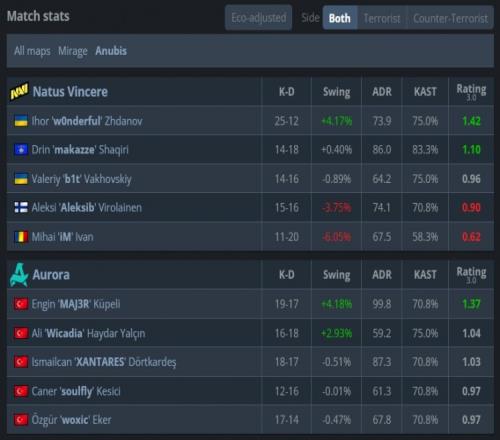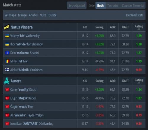 图一NAVI选图荒漠迷城作T先攻,手枪局NAVI强攻A点失手,次回合NAVI强起拱门夹A被杀四人,第3回合NAVI纯E,wonderful沙鹰手撕woxic大狙后,捡起大狙单局四杀帮助NAVI拿到首分。Aurora第4回合直接存钱让NAVI扳平比分。第5回合长枪局,NAVI五人A区爆弹下包,Aurora五人没道具直接B点保枪。后续NAVI一路将比分扩大至8-3,半场前最后一回合,wonderful打赢1v2残局,NAVI以9-3结束上半场。