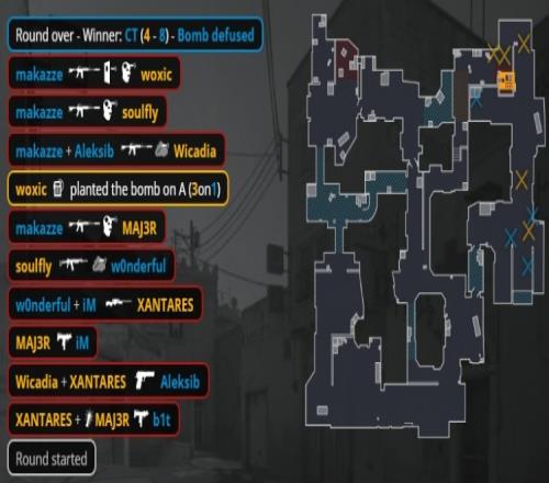 图四Aurora选图Dust2作T先攻,上半场手枪局wonderful反绕A小双杀,NAVI回防A点团灭Aurora后拿到首分。次回合Aurora强起,小李子吹风机前顶A小扫转三杀再下一城,第3回合Woxic英雄鸟狙带队打B被makazze三杀,NAVI连拿3分。