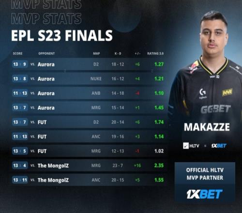 第22回合NAVI爆弹进B二换三,MAJ3R绕B洞来B双杀,wonderful双杀收尾,NAVI以13-9拿下图四,大比分3-1战胜Aurora,勇夺EPL S23冠军!
