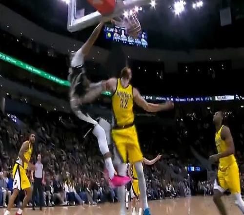 而最离谱的是,出现这种情况之后,字母哥并没有直接退场,在步行者快攻回合结束后,还留在前场的字母哥接队友传球,加速冲向篮筐又是一记暴力扣篮。