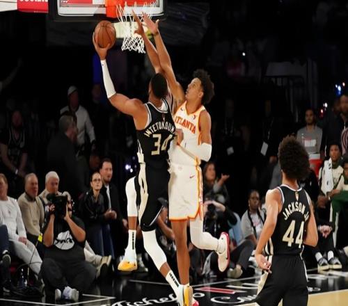 字母哥外线持球,冲击步行者内线,两人对抗之后,字母哥转身加速挤进禁区,随后就是一记隔扣。