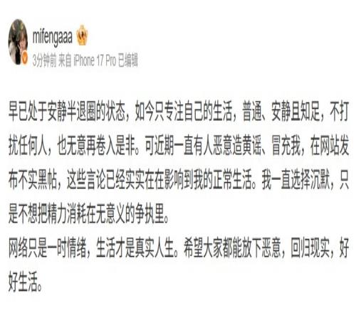早已处于安静半退圈的状态,如今只专注自己的生活,普通、安静且知足,不打扰任何人,也无意再卷入是非。可近期一直有人恶意造黄谣、冒充我,在网站发布不实黑帖,这些言论已经实实在在影响到我的正常生活。我一直选择沉默,只是不想把精力消耗在无意义的争执里。