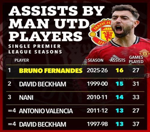 - 双百俱乐部: 赛季还剩8场,B费已经追平了鲁尼和吉格斯,成为曼联队史仅有的达成“100球+100助攻”的球员。