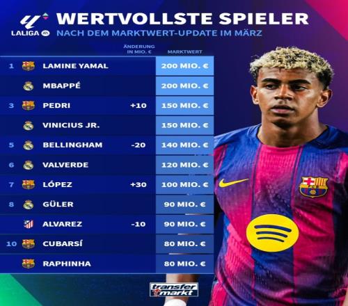 体育播报03月16日宣 今日德转更新了西甲球员身价。姆巴佩、亚马尔仍为2亿欧并列世界第一,佩德里1.5亿与维尼修斯并列第3,贝林厄姆跌至1.4亿,费尔明暴涨3000万升至1亿。