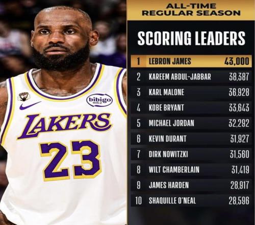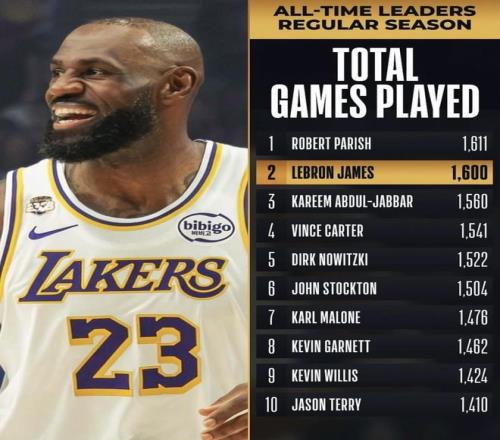 杜兰特继续往上追,最后绕不开的人还是詹姆斯。2月23日,NBA官网把詹姆斯的最新位置摆到了台面上:他在自己的第1600场常规赛里跨过43000分,继续排在历史得分榜第一;与此同时,他的常规赛总出场数也来到1600场,升到历史第二,只落后帕里什的1611场。这样一来,杜兰特要追更高的得分排名,抬头看到的是詹姆斯;而詹姆斯现在不只压着历史得分榜,常规赛总出场次数榜也已经逼到第一门口。