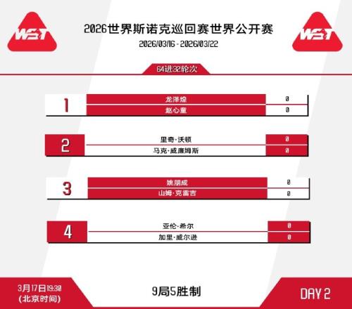 19点30分,赵心童对阵龙泽煌;马克·威廉姆斯迎战里奇·沃顿